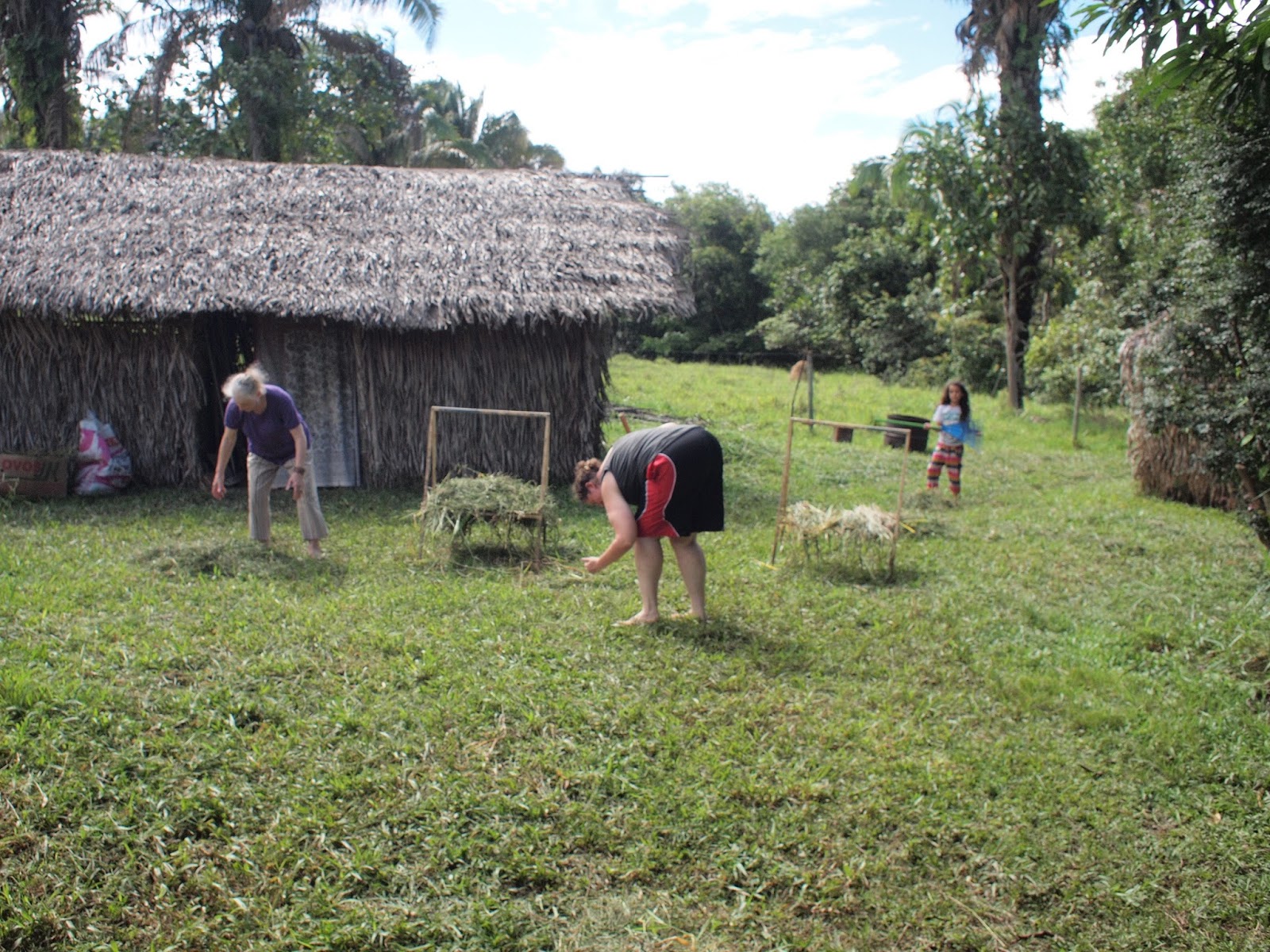 | Jaqi, Grace, and Camila hurry to get the hay in before the rain. |